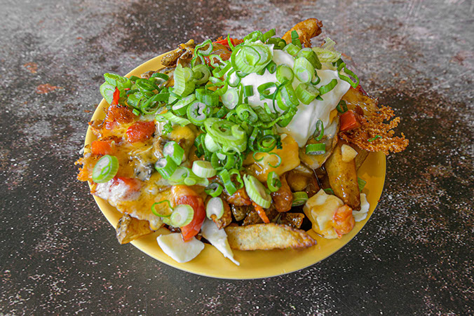 VIANDE HACHÉE, OIGNONS, TOMATES, CRÈME SURE, CHEDDAR TEX-MEX ET JALAPEÑOS